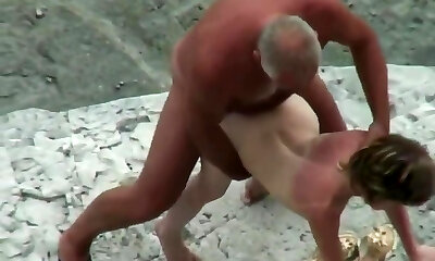 Old and young horny couple pummeling at the beach