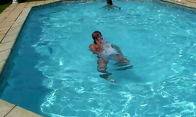 pornstar indécent filmé par des caméras dans une piscine d'eau se préparant à l'action