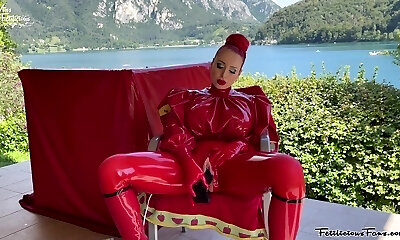 Redhead bombshell wearing a latex corset and ass dildoing herself