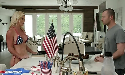 Booty platinum-blonde tootsie in blue bikini Amanda Tate is gonna give hard Dt