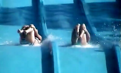 Lovely and fresh pale skin teen babe in bathing suit dives in the pool