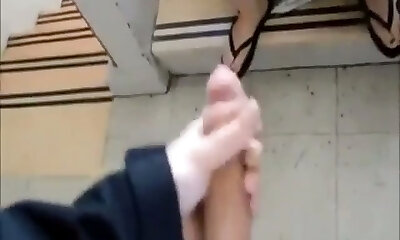 Guy jerks off his fat cock at an unsuspicious girl